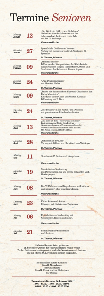 Die Senioren der Vaterunserkirche und der kath. Pfarrei St. Thomas haben ein gemeinsames Programm. Es gibt regelmäßige Treffen, abwechselnd am Montag (Vaterunserkirche) oder Dienstag (St. Thomas). Die genaueren Termine erfahren Sie hier oder aus dem Programm, welches im Vorraum des Gemeindehauses aufliegt