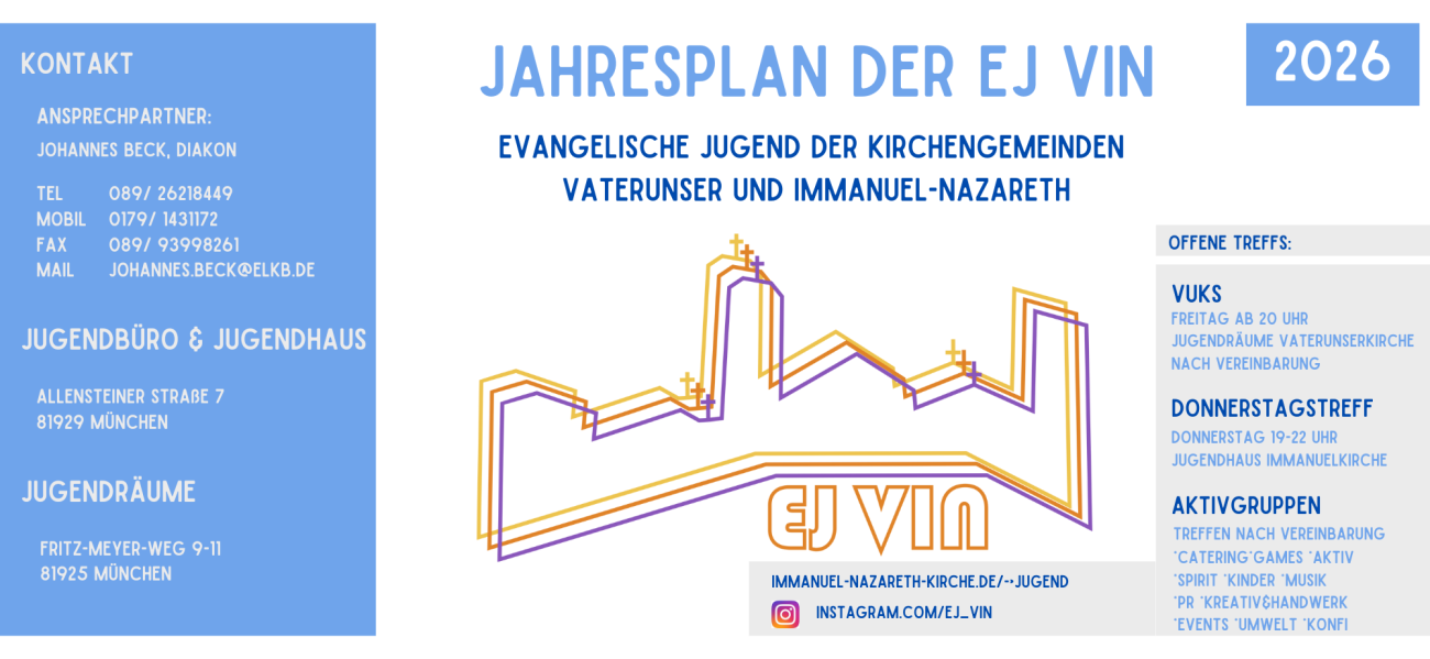 Seit 2002 haben die Immanuelkirche und die Vaterunserkirche eine gemeinsame Jugendarbeit. Als im Jahre 2010 die Kirchengemeinde Immanuel mit Nazareth fusionierte, erweiterte sich unsere Jugend nochmal. Drei Kirchen und zwei Gemeinden, mit 50 aktiven Jugendlichen bilden unsere Jugend, die Teil der Evangelischen Jugend München des Prodekanats Osten ist! Mit so vielen Mitarbeitern, gehören wir zu einer der größten Jugendarbeiten Münchens. Durch die Veränderungen hat sich nicht nur unser Name zu „Evangelische Jugend der Kirchengemeinden Vaterunser und Immanuel-Nazareth“ verändert, sondern das Spektrum an Aktivitäten, Projekten und Wochenenden hat sich erweitert.