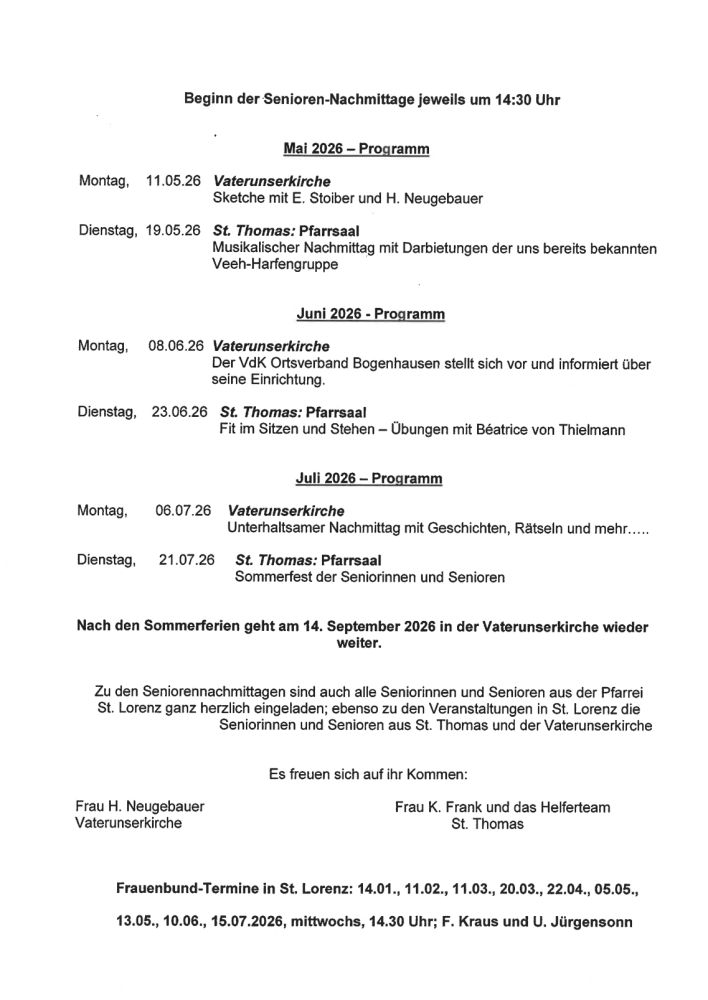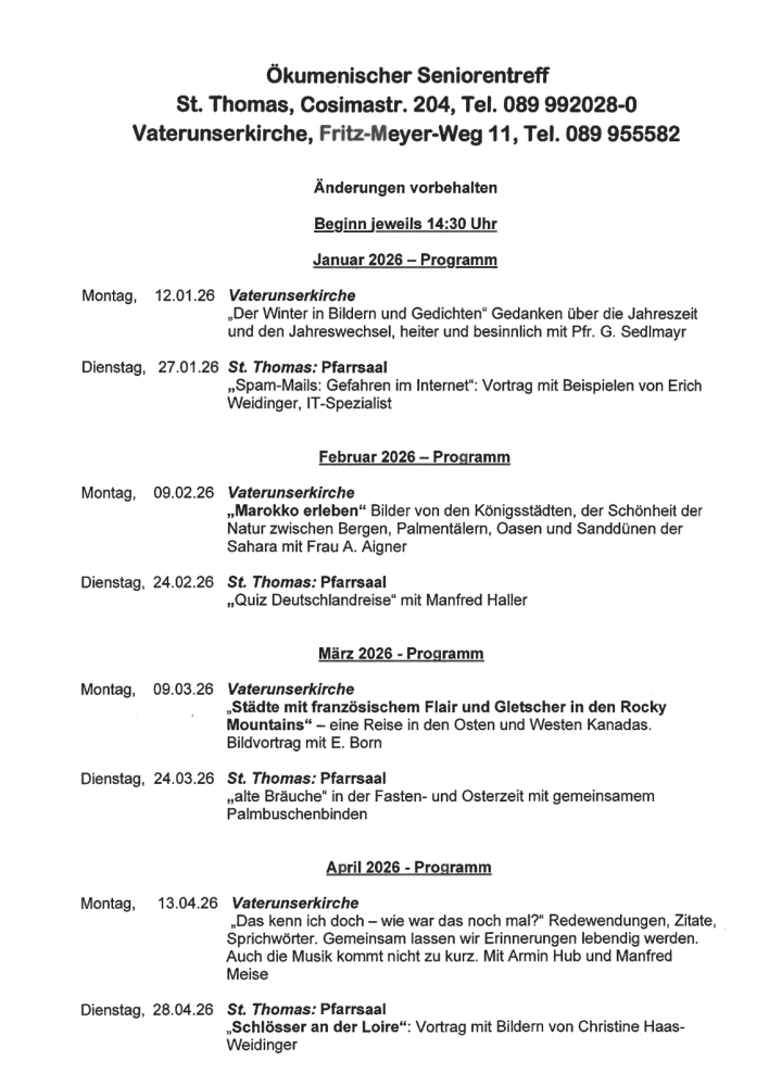 Die Senioren der Vaterunserkirche und der kath. Pfarrei St. Thomas haben ein gemeinsames Programm. Es gibt regelmäßige Treffen, abwechselnd am Montag (Vaterunserkirche) oder Dienstag (St. Thomas). Die genaueren Termine erfahren Sie hier oder aus dem Programm, welches im Vorraum des Gemeindehauses aufliegt